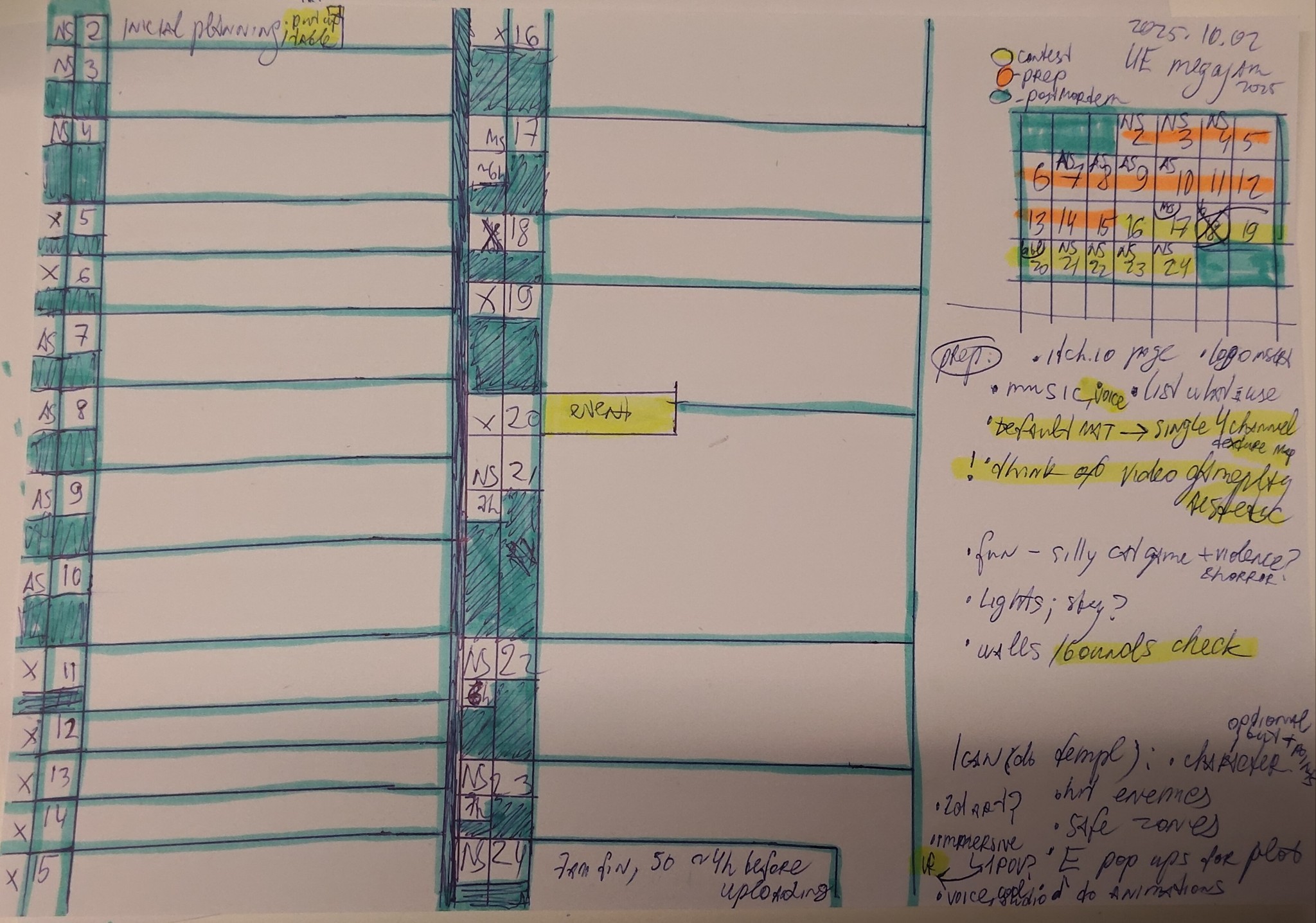 Attached image showcases my early brainstorming sessions when I decide if I’m doing the jam or not before the jam starts. Left column is for 14 days before the jam starts, when I can prepare placeholder template, find generic assets and roughly plan what type of game I can do with my current knowledge, so working once the theme announced will be much easier. By the rules of this jam, it is allowed to prepare stuff before jam, but you need to note these things when submitting.